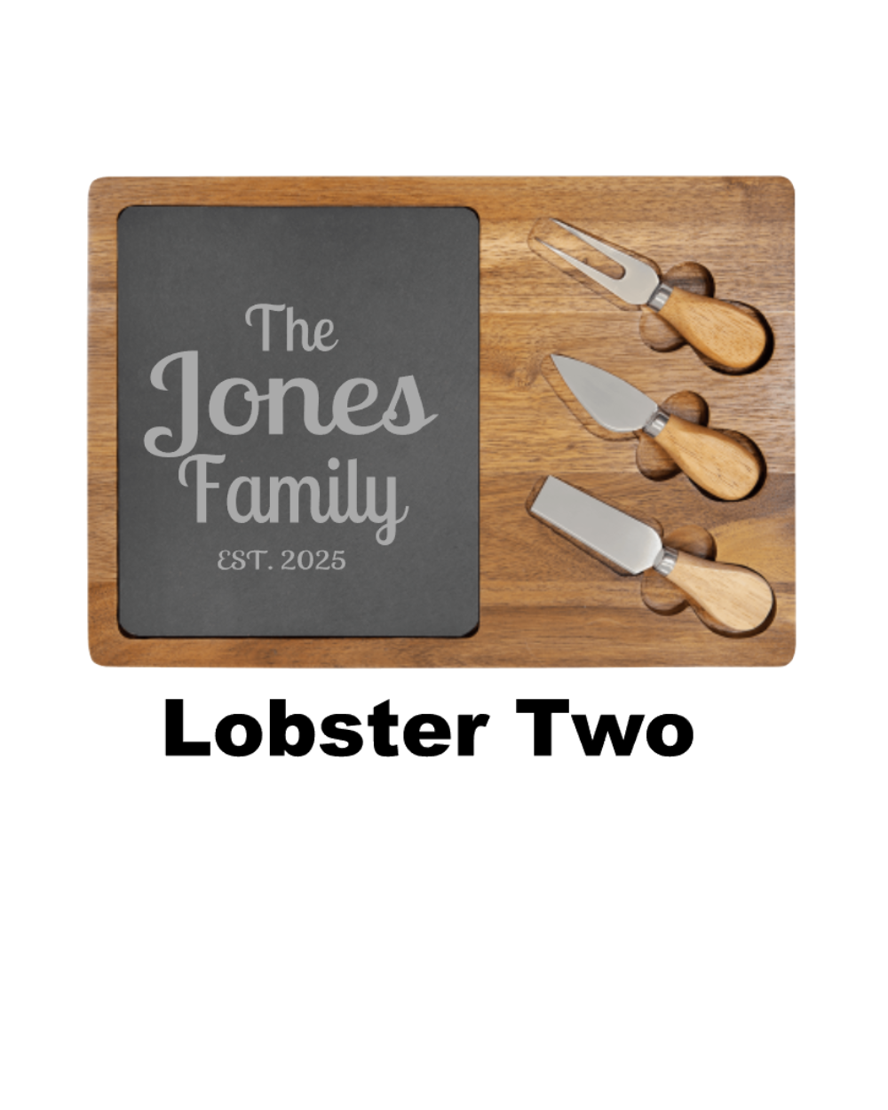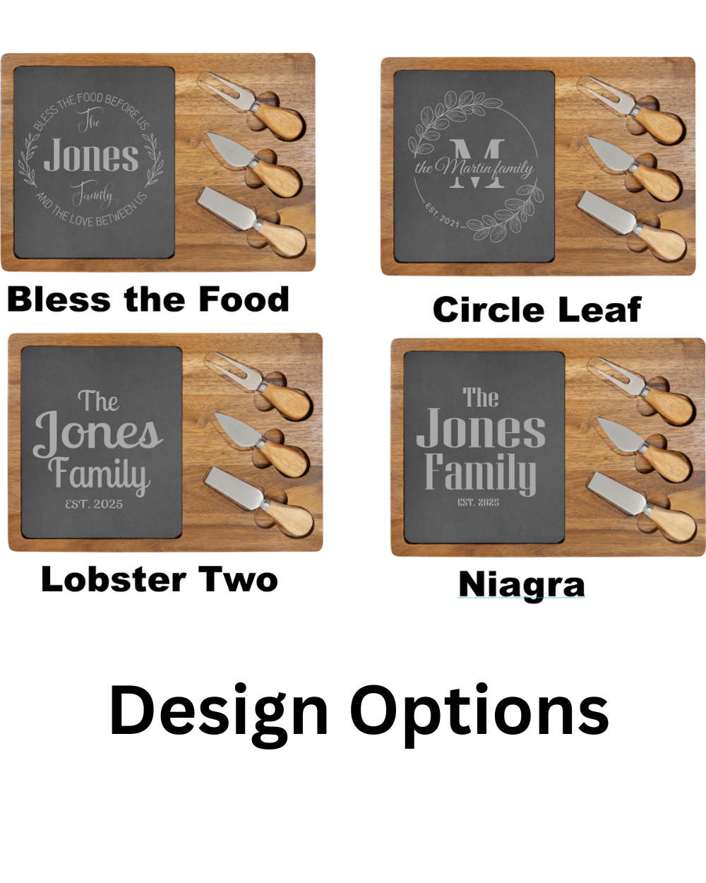 This attractive cheese set features a Slate cutting board framed by Acacia Wood, along with 3 tools (a cheese serving fork and 2 knives)on the front and a beautiful Acacia Wood back. Both can be personalized with the grahics of choice. If you're looking for a great personalized gift for a wedding, house warming, or just about any occasion,this may be it!